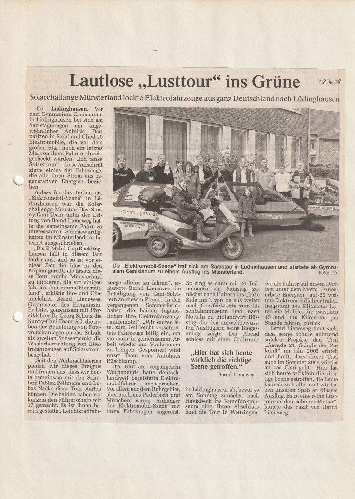 Danach sind die Elektroautos auf dem Schulhof des Gymnasium Canisianum, Disselhook 6, in Lüdinghausen willkommen und werden der Öffentlichkeit präsentiert. Traditionell gibt es abends Pizza vom Blech.